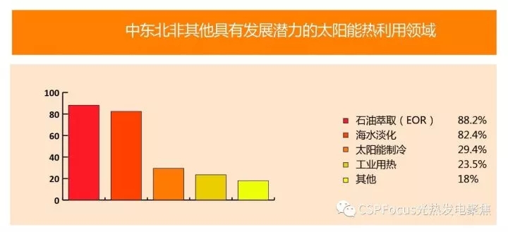 除用于發(fā)電以外,光熱高溫利用在MENA地區(qū)應用前景也被普遍看好。其中,該地區(qū)因缺水、石油資源豐富等特殊條件對于海水淡化、稠油開采的需求巨大,給予太陽能中高溫應用無限的發(fā)展空間。