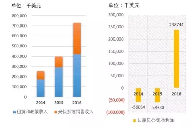 政策收入和光伏租賃業(yè)務(wù)是SolarCity目前的主要收入來源。據(jù)SolarCity公布的財報數(shù)據(jù),2016年公司實現(xiàn)營業(yè)收入7.30億美元,其中來自光伏系統(tǒng)租賃和政策收入占總收入比重過半,為4.22億美元,同比增長43.87%。