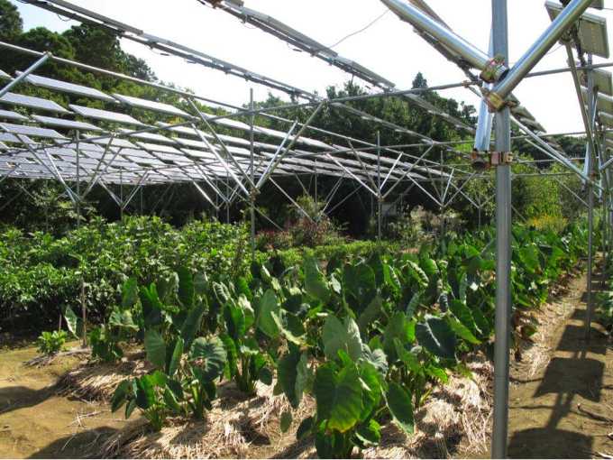 如上圖所示,太陽能發(fā)電板在上面曬太陽、發(fā)電,下面的空間用來養(yǎng)殖木耳。木耳適合光照少的生長環(huán)境,因此置于太陽能發(fā)電板下養(yǎng)殖,是很合適的。此外,在太陽能發(fā)電板下種土豆等光照要求不高的植物也是不錯的選擇。