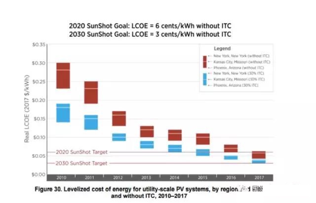 這樣,美國(guó)公共事業(yè)級(jí)光伏電站已經(jīng)基本實(shí)現(xiàn)能源部2011年為2020年設(shè)定的成本下行目標(biāo)(Sunshot Goal):度電平準(zhǔn)成本6美分/千瓦時(shí)、系統(tǒng)投資成本1美元/瓦。