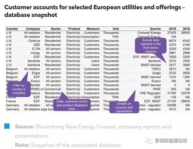 中國(guó)儲(chǔ)能網(wǎng)訊:該數(shù)據(jù)庫(kù)按照地理位置對(duì)歐洲各大電力公司的用戶根據(jù)時(shí)間進(jìn)行統(tǒng)計(jì),排序及整理,主要關(guān)注住宅用戶及其服務(wù)形式。在一定程度上,這些數(shù)據(jù)也是我們相關(guān)研究報(bào)告歐洲電廠住宅電力零售策略的基礎(chǔ)數(shù)據(jù)分析。