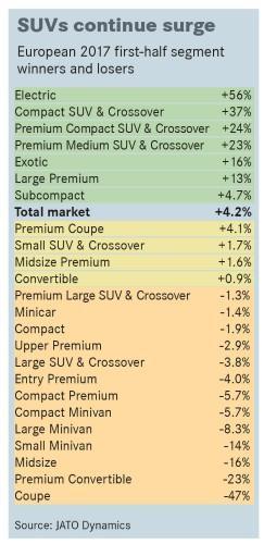 今年上半年,歐洲車市增長第二快的板塊則是緊湊型SUV以及跨界車,增速高達37%,達到了989421輛。其中,全新的標致3008極大的促進了板塊銷量增長,今年上半年,標致3008的總銷量超過了8.1萬輛,并成為板塊內(nèi)排名第三的品牌,第一為日產(chǎn)Qashqai(136480輛),第二為大眾Tiguan(128033輛)。