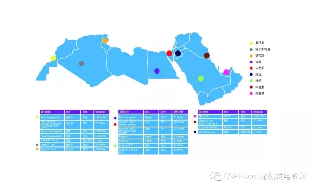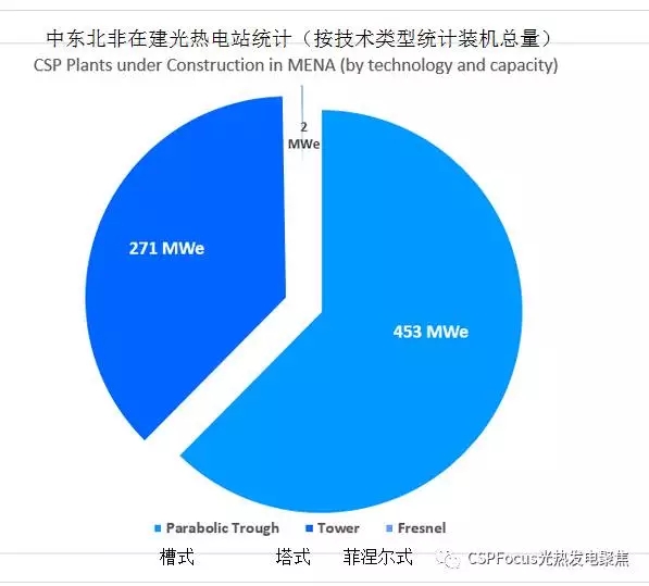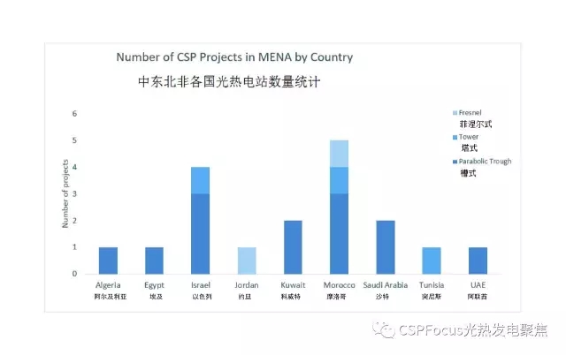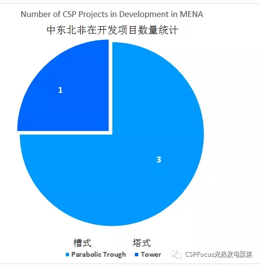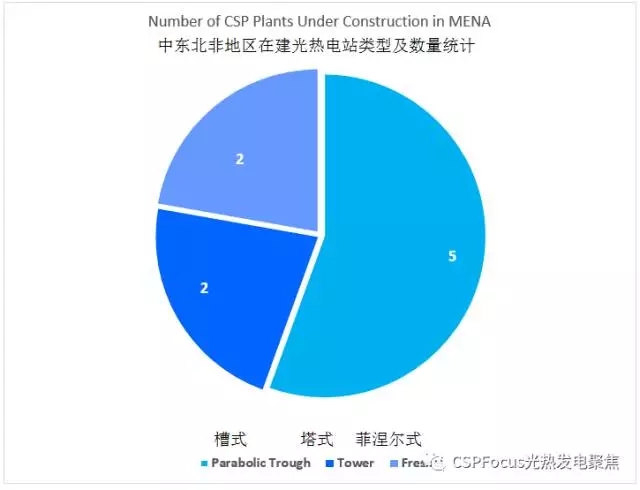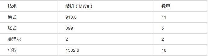 目前MENA地區(qū)擁有光熱項目總數(shù)為18個,合計裝機量為1332.8 MWe。從技術類型上來看,槽式占大部分,菲涅爾式為試驗性小型電站。