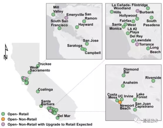 截止到7月份加州地區(qū)加氫站分布情況