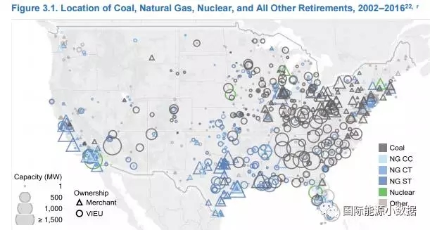 首先,到底是哪些、什么樣的煤電廠關(guān)閉了呢?研究報告指出,2002年到2016年間美國共有531座煤電廠關(guān)閉(大約59吉瓦),特別是2015年在各種退役的電廠中有80%是煤電廠。已經(jīng)關(guān)閉的以及預(yù)計關(guān)閉的煤電廠有以下特點(diǎn):
