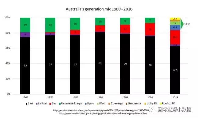 中國儲能網(wǎng)訊:根據(jù)澳大利亞政府環(huán)境和能源部的統(tǒng)計(jì)數(shù)字,2016年澳大利亞的發(fā)電量中仍有62.9%來自煤電,18.5%天然氣發(fā)電,2.3%為燃油發(fā)電,可再生能源比例為16.2%(其中6.9%水電、5%風(fēng)電、2.7%屋頂光伏)。相比之下,1960-1970年之間,澳大利亞可再生能源發(fā)電比例曾達(dá)到19%;1980年可再生能源發(fā)電比例為16%,與2016年相仿。