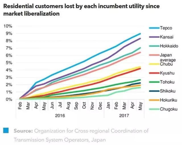 日本電力市場改革:日本當下進行的能源市場改革,正對市場競爭產生重大的影響。在2017年第一季度期間,現(xiàn)有電廠的發(fā)電量下降至63%,創(chuàng)歷史新低。2017年,日本電力批發(fā)市場的月交易量創(chuàng)歷史新高,而電力零售市場方面,日本6.7%的電力居民用戶(即超過400萬的用戶)已申請更換他們的電力零售商。上述趨勢都將進一步發(fā)展。