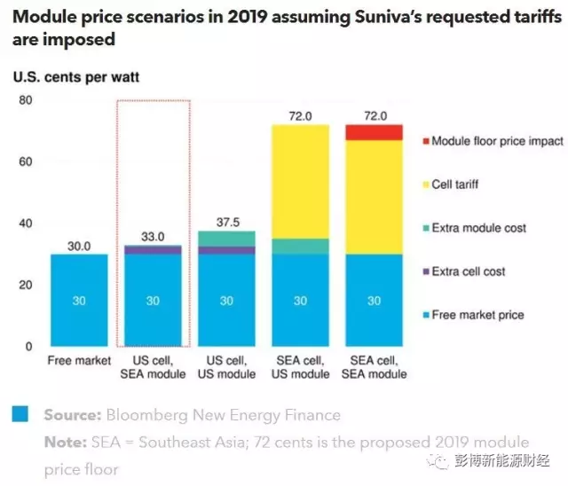 假設(shè)中國公司在美國投建的GW級(jí)光伏電池生產(chǎn)廠在2019年投產(chǎn),并將生產(chǎn)的電池運(yùn)往東南亞或墨西哥封裝成組件,則該組件相較于電池和組件都在東南亞完成的情景會(huì)產(chǎn)生大約3美分/W的額外費(fèi)用。假設(shè)這筆額外費(fèi)用直接反映在產(chǎn)品售價(jià)上,在美國的組件售價(jià)會(huì)被抬高約10%。