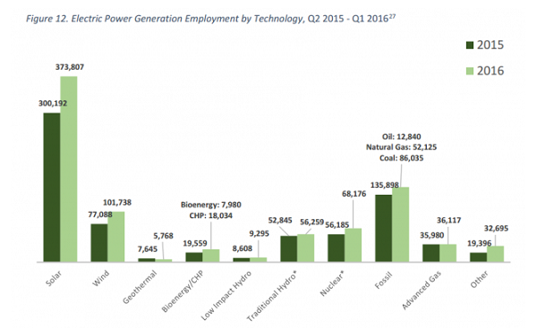 美國能源部“美國能源與就業(yè)報告”中一份報告中就指出,2016 年第一季的太陽能發(fā)電業(yè)相關業(yè)者達37 萬人,占了能源業(yè)從業(yè)人數(shù)的43%,是能源業(yè)中比率最高,比前一年成長了25%。由此看來,太陽能發(fā)電業(yè)為美國創(chuàng)造了可觀的就業(yè)數(shù)字。報告也指出,燃煤發(fā)電的發(fā)電量從2006 年到2016 年9 月之間減少了53%,且還在持續(xù)減少之中,同一時期太陽能發(fā)電量則提高了5,000%。