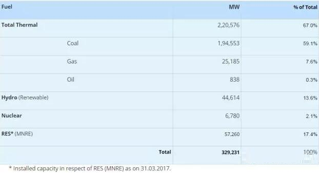 中國(guó)儲(chǔ)能網(wǎng)訊:根據(jù)電力部最新發(fā)布的數(shù)據(jù),到2017年6月30日止,印度發(fā)電總裝機(jī)達(dá)到329.231吉瓦,其中煤電裝機(jī)占59.1%、天然氣7.6%、大型水電13.6%、核電2.1%,其他可再生能源(包括小水電、生物質(zhì)發(fā)電、城鄉(xiāng)垃圾發(fā)電、太陽(yáng)能、風(fēng)能)占比17.4%。