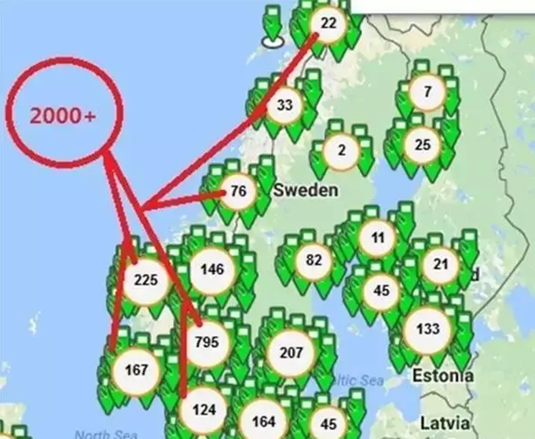 挪威的充電設(shè)施發(fā)展比較早,2011年建了一批充電設(shè)施(1000個(gè)),隨著后續(xù)IEC標(biāo)準(zhǔn)實(shí)施,到2015年底為1500多個(gè),到現(xiàn)在為2000個(gè)充電點(diǎn)。整個(gè)挪威充電點(diǎn)分布相對(duì)比較集中,每處充電點(diǎn)配置的樁數(shù)是不同的。