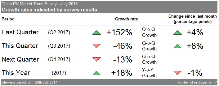 該報(bào)告分析認(rèn)為,發(fā)改委能源局公布2017年上半年整體裝機(jī)達(dá)24Gw,調(diào)研參與者提供的趨勢(shì)同發(fā)改委能源局公布的新聞口徑一致;三季度雖然會(huì)走弱,但絕對(duì)值預(yù)期卻在走強(qiáng)。主要原因是訂單充足以及二季度未完成項(xiàng)目延期到三季度。約5GW領(lǐng)跑者項(xiàng)目最早將于三季度末完成裝機(jī),甚至有部分項(xiàng)目會(huì)推遲到四季度末完成;政府扶持方式面臨重大改變。105GW的十三五光伏發(fā)展規(guī)劃裝機(jī)目標(biāo)會(huì)上調(diào)至150GW。補(bǔ)貼方式可能會(huì)由純撥款型補(bǔ)貼逐步轉(zhuǎn)向市場(chǎng)引導(dǎo)式;四季度裝機(jī)情況不被看好,因?yàn)椴淮_定性太高。超出預(yù)期的上半年裝機(jī)給并網(wǎng)及財(cái)政補(bǔ)貼帶來了空前壓力,年底政策上下行均有可能,最終取決于高層部門同光伏行業(yè)從業(yè)者的博弈結(jié)果。