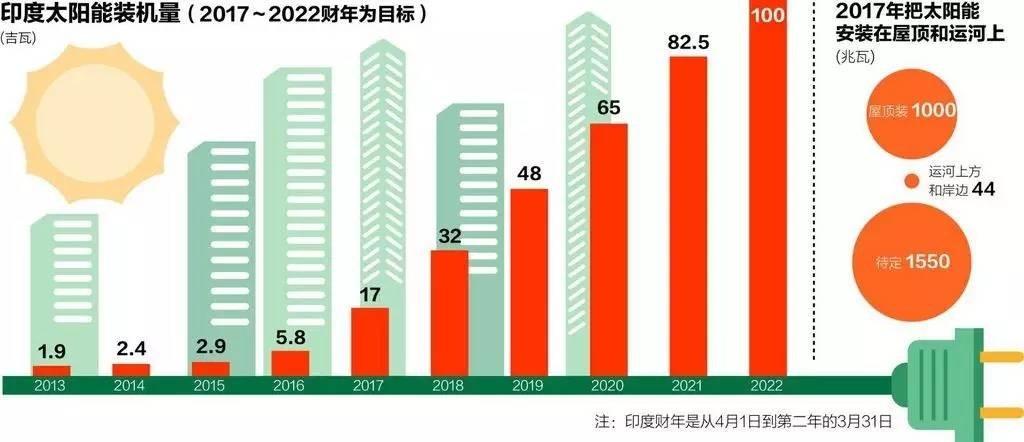 早在2014年,印度總理莫迪宣布了一個(gè)計(jì)劃:到2022年,印度要實(shí)現(xiàn)100GW的太陽(yáng)能裝機(jī)容量。