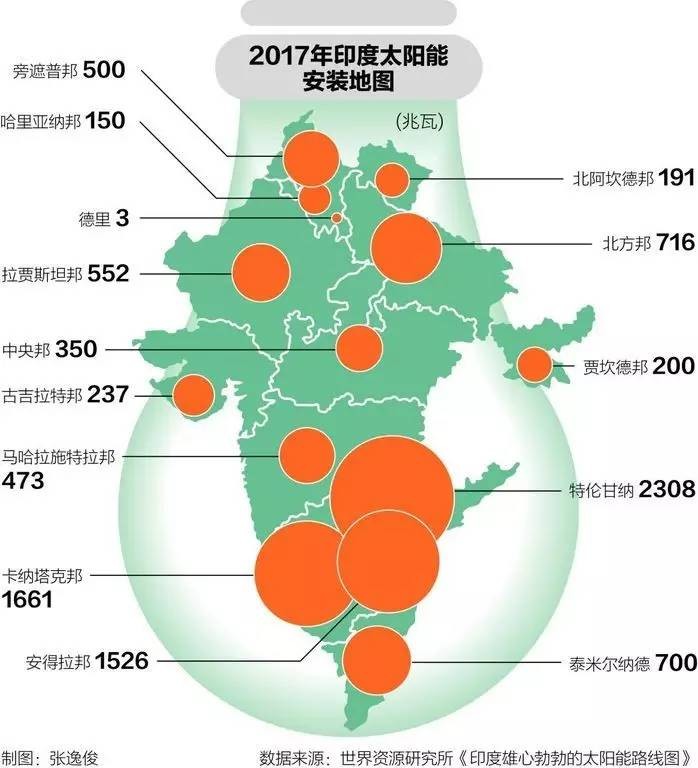 特倫甘納(Telangana)、卡納塔卡(Karnataka)和泰米爾納德(TamilNadu)將會(huì)在2017年見(jiàn)證到最多的太陽(yáng)能裝機(jī)增量,三地新增的裝機(jī)總量將會(huì)超過(guò)全年總量的三分之一。