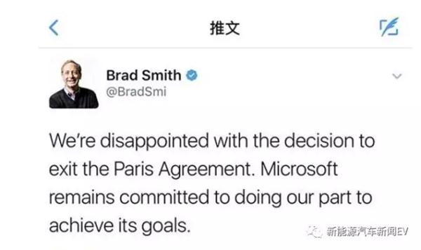 微軟總裁布拉德·史密斯:“對(duì)于退出巴黎協(xié)定的決定感到失望,微軟承諾會(huì)做好自己的工作來(lái)完成協(xié)議的目標(biāo)?!?