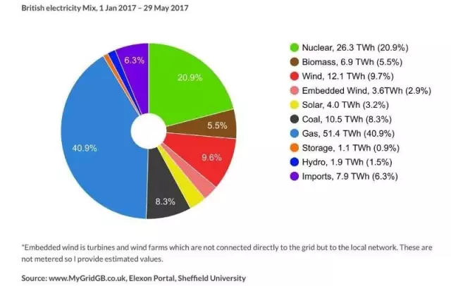 中國(guó)儲(chǔ)能網(wǎng)訊:根據(jù)MyGridGB的數(shù)據(jù),2017年1月1日至5月29日這5個(gè)月間英國(guó)電力供應(yīng)中有51.4TWh來(lái)自天然氣發(fā)電,占總量的40.9%,其次是核電(26.3TWh,20.9%)、風(fēng)電(15.7%,12.6%)、煤電(10.5TWh,8.3%)、生物質(zhì)發(fā)電(6.9TWh,5.5%)、太陽(yáng)能(4.0TWh,3.2%)、水電(1.9TWh,1.5%)、儲(chǔ)能(1.1TWh,0.9%);此外還有7.9TWh來(lái)自進(jìn)口,占電力供應(yīng)的6.3%。