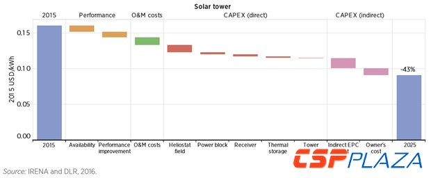圖:塔式光熱電站2025年之前的成本下降曲線(數(shù)據(jù)來(lái)自IRENA 2016年發(fā)布的報(bào)告)