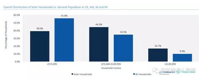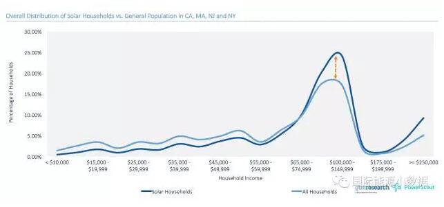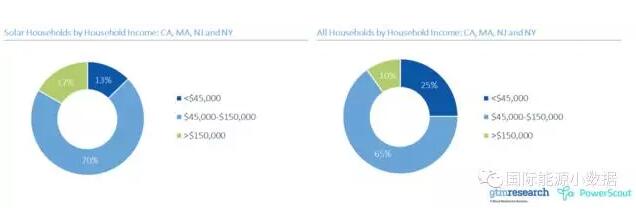 那么,屋頂光伏是不是真的只是富人“玩具”?GTM Research和PowerScout公司針對這一問題對美國加利福尼亞、馬薩諸塞、新澤西、紐約四個州的50多萬戶屋頂光伏用戶(“光伏家庭”)進行統(tǒng)計分析,得出以下結論: