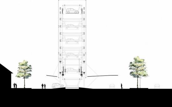 塔樓則被涂覆了反射性、多孔金屬,它的第一層被用來(lái)停車充電,如果你正在到處尋找停車位或者急需充電,這座充電塔樓還創(chuàng)造了一種“燈塔”效應(yīng)指引你前往相應(yīng)的位置。