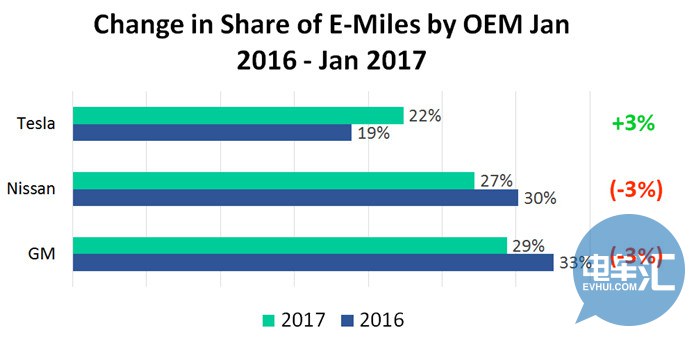 綜合報(bào)告數(shù)據(jù),通用汽車(chē)以及日產(chǎn)汽車(chē)從2012年起就開(kāi)始保持了平穩(wěn)的增長(zhǎng)速度。但伴隨著Model S和Model X的陸續(xù)推出,特斯拉僅在2016-2017年的不到兩年內(nèi),就躋身美國(guó)電動(dòng)汽車(chē)?yán)鄯e行駛里程的前三甲,并迅速處于行業(yè)領(lǐng)先地位。從2016年1月份到2017年,特斯拉的電動(dòng)行駛里程的份額上漲了3%,而日產(chǎn)以及通用汽車(chē)的份額均下降了3%。
