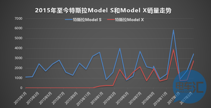 如下圖顯示,2016年3月之后,Model X市場(chǎng)表現(xiàn)變得強(qiáng)勁;2016年末銷(xiāo)量達(dá)到了峰值,月銷(xiāo)量接近4000。
