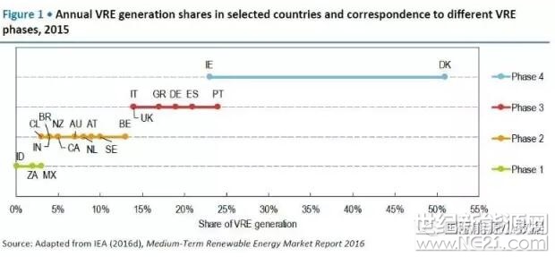 國際能源署發(fā)布報告Getting Wind and Sun onto the Grid,按照電網(wǎng)吸納間歇性可再生能源(主要是風電、光伏)的比例劃分了4個階段: