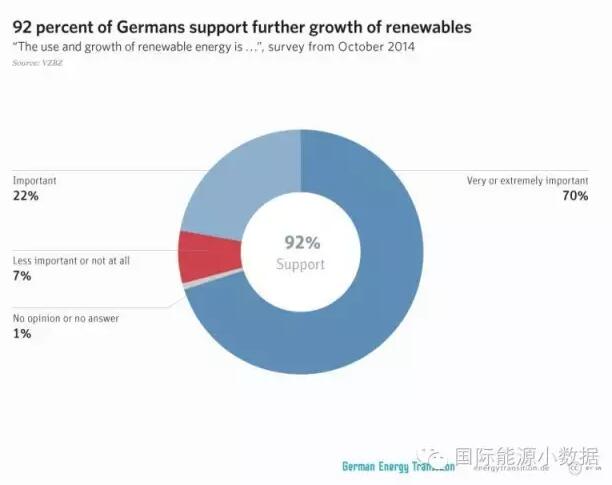 中國(guó)儲(chǔ)能網(wǎng)訊:德國(guó)能源轉(zhuǎn)型,發(fā)電總量中可再生能源比例已經(jīng)超過(guò)30%,而居民電價(jià)也在歐洲國(guó)家中相對(duì)比較高。然而,民意調(diào)查顯示,德國(guó)民眾中92%支持能源轉(zhuǎn)型(70%認(rèn)為能源轉(zhuǎn)型非常重要、22%認(rèn)為能源轉(zhuǎn)型比較重要),只有8%的民眾對(duì)能源轉(zhuǎn)型持負(fù)面態(tài)度。