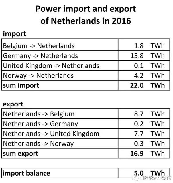 如下表所示,2016年荷蘭進口22 TWh(220億千瓦時),其中15.8 TWh來自德國、4.2TWh來自挪威,來自英國的進口可以忽略不計。同時,2016年荷蘭出口16.9 TWh,其中8.8 TWh流向比利時、7.7 TWh流向英國。進出口來龍去脈兩相比較,可以看出德國的風(fēng)電光伏相當一部分是經(jīng)過荷蘭去了英國。