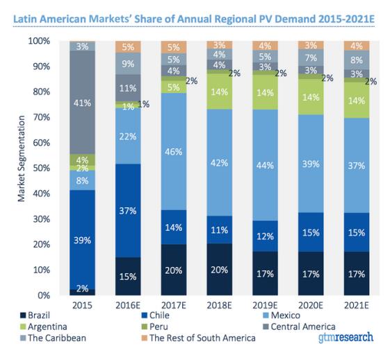 今年,拉丁美洲有望將全球光伏需求占比提高到6.2%,2016年這一數(shù)字約為2.4%。報告指出,潛力增長市場主要集中于墨西哥和智利。同時,阿根廷和哥倫比亞等新興市場正在崛起,而區(qū)域巨頭巴西則將在低迷中反彈。