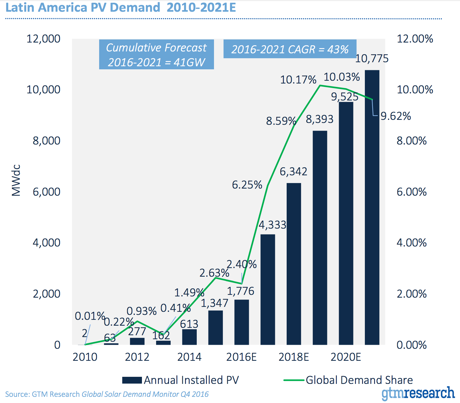 鑒于這些發(fā)展,拉丁美洲市場正在指數(shù)級增長,2016年~2021年預(yù)測將有41GW的光伏需求,年度裝機量同比增長一倍以上。到2020年,拉丁美洲將占全球光伏需求的10%。