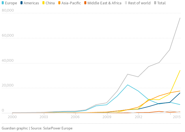 歐洲市場的增勢亦非常顯著,并且在 2016 年初跨過了 100 GW 的里程碑。在那之后,增勢略有放緩。歐盟呼吁,到 2010 年時,要將可再生能源的比重從 20% 提升到 35% 。