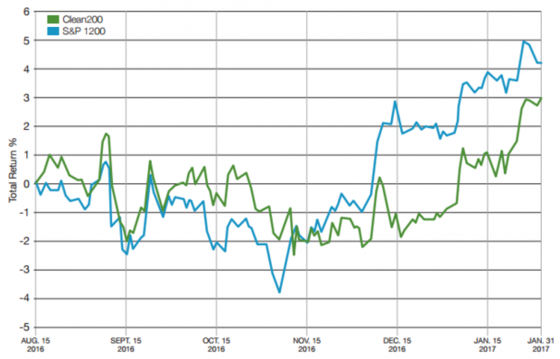 橫向:時(shí)間 縱向:回報(bào)率百分比 綠色線:綠色企業(yè)200強(qiáng) 藍(lán)色線:標(biāo)普1200強(qiáng)