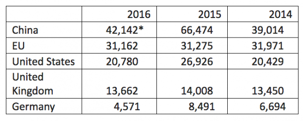 報(bào)告作者解釋說:“中國上榜企業(yè)數(shù)量的減少與中國企業(yè)清潔能源業(yè)務(wù)上的收益下降關(guān)系不大。這71家企業(yè)的總清潔能源收益為432億美元,而在去年8月的榜單上為437億美元。”