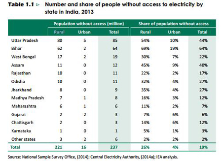 印度各邦城市(Urban)、農(nóng)村(Rural)無電人口數(shù)與比例(2013),來源:國(guó)際能源署印度能源展望報(bào)告(2015)