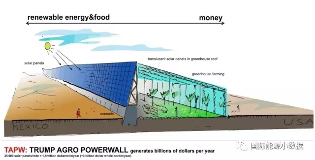 按照這個(gè)創(chuàng)意,每英里的光伏墻每年可發(fā)電1600兆瓦時(shí),收益16萬美元。這樣,2000英里的光伏墻每年發(fā)電量占到墨西哥電力消費(fèi)的5%,收益3.2億美元,墨西哥可以用這個(gè)錢來支付建墻的費(fèi)用。另外,在美國一側(cè),還可以做“光伏+農(nóng)業(yè)”,從種植業(yè)獲得收益。