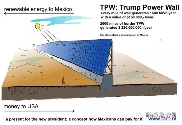 中國儲(chǔ)能網(wǎng)訊:特朗普不是執(zhí)意要在美墨邊境建墻嗎?不是經(jīng)費(fèi)沒有著落嗎?荷蘭一家設(shè)計(jì)所(FARO)為特朗普總統(tǒng)獻(xiàn)計(jì)獻(xiàn)策,設(shè)計(jì)了Trump Power Wall(TPW),把這座分割兩國邊境的墻變成造福兩國的光伏墻。