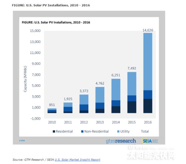 中國儲能網(wǎng)訊:根據(jù)GTM Research和太陽能工業(yè)協(xié)會(SEIA)發(fā)表的最新數(shù)據(jù)顯示,2015年至2016年,美國太陽能市場增幅達95%,裝機量高達14.6GW。2016年是美國太陽能市場標志性的一年。