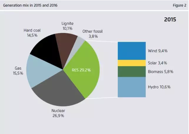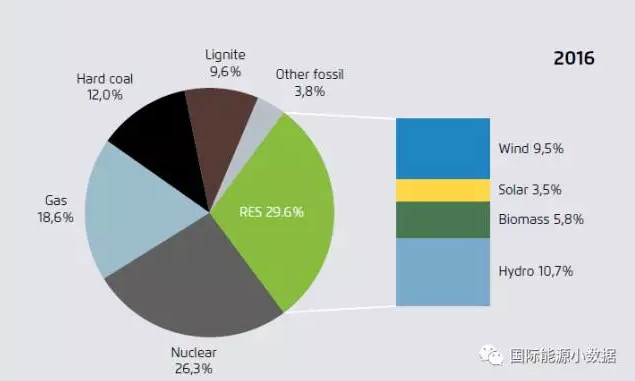 如果把各類可再生能源(水電、風電、生物質、太陽能)整體計算,2016年在歐盟發(fā)電總量中占比為29.6%,比2015年(29.2%)略有上升,顯示歐盟可再生能源發(fā)展進入了瓶頸期。