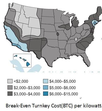 下面的地圖(圖三)顯示的就是美國每個州的BTC值。從地圖上可以看出,夏威夷有最高的BTC值,意味著這里電費最貴,最適宜采用光伏發(fā)電。加州和紐約也是比