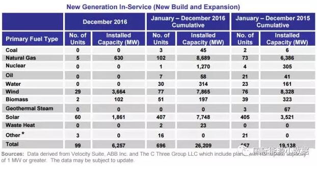 中國(guó)儲(chǔ)能網(wǎng)訊:根據(jù)美國(guó)聯(lián)邦能源監(jiān)管委員會(huì)(FERC)提供的數(shù)據(jù),2016年美國(guó)新增發(fā)電裝機(jī)容量26.209吉瓦,其中天然氣發(fā)電裝機(jī)8.689吉瓦、風(fēng)電7.865吉瓦、太陽(yáng)能7.748吉瓦,此外還有1臺(tái)核電機(jī)組(1.270吉瓦)投入運(yùn)行。
