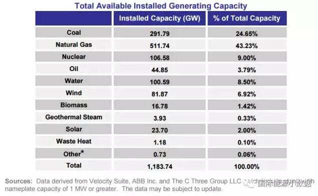 至2016年底,美國(guó)可用的發(fā)電裝機(jī)總?cè)萘繛?183.74吉瓦,其中天然氣發(fā)電511.74吉瓦(43.23%)、煤電291.79吉瓦(24.65%)、核電106.58吉瓦(9.00%)、水電100.59吉瓦(8.50%)、風(fēng)電81.87吉瓦(6.92%)、太陽(yáng)能發(fā)電23.70吉瓦(2.00%)。