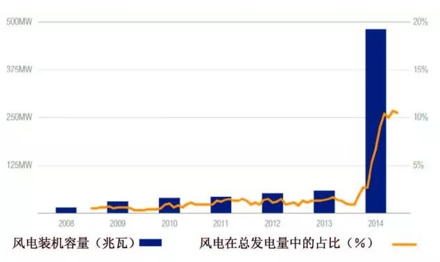 烏拉圭的改革為進一步快速擴大風電投資提供了穩(wěn)定的政策環(huán)境和相關(guān)的技術(shù)經(jīng)驗,該國目前每年在清潔能源開發(fā)方面獲得的投資額超過了十億美元。隨著風電的快速發(fā)展,該國正在不斷突破預(yù)定目標。烏拉圭政府原計劃于2015 年使風電裝機容量達到30 萬千瓦,但由于實際發(fā)展好于預(yù)期,最終的裝機容量達到了50 萬千瓦?,F(xiàn)如今,烏拉圭的目標是在2017年前使風電在全國總電力中的占比達到38%,這將是目前份額的兩倍多。