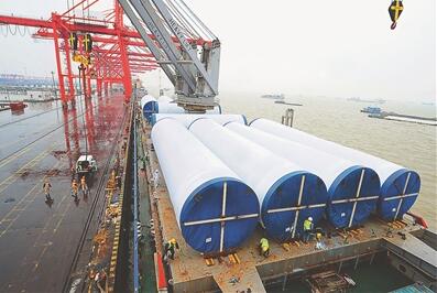 中國儲能網(wǎng)訊:1月18日,滿載著4根32段風(fēng)電塔筒的長航寧海輪在江蘇省太倉港集裝箱碼頭完成吊裝,經(jīng)由太倉港出口泰國林查班港。該塔筒是由中建五洲工程裝備有限公司承建的泰國GNP67.5MW風(fēng)電項目的主要裝備,筒體分為8段,單套重量達(dá)512噸,輪轂高度達(dá)153米,接近世界之最,是亞洲目前最高的風(fēng)力發(fā)電塔筒。