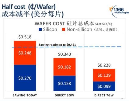 如上圖所示,那條藍(lán)色的線就是多晶金剛線切割所達(dá)到的成本極限,1366科技認(rèn)為,當(dāng)產(chǎn)量達(dá)到3GW時(shí)采用直接法硅片技術(shù),硅成本可達(dá)$0.158/片,當(dāng)產(chǎn)量達(dá)到7GW時(shí),硅成本達(dá)到$0.099/片。直接法硅片技術(shù)為延續(xù)多晶的市場(chǎng)主導(dǎo)地位提供了一種成本極低的選擇。