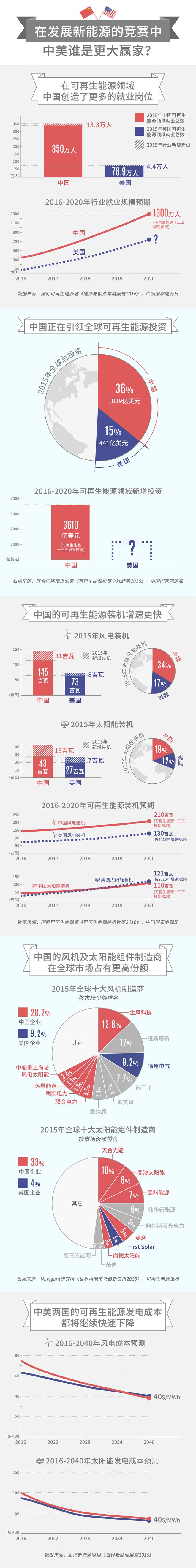 從可再生能源的投資規(guī)模看來,中國在2015年以1029億美元(占全球可再生能源總投資的36%)的投資額排在全球首位。同年美國則以441億美元的投資額位居第二。