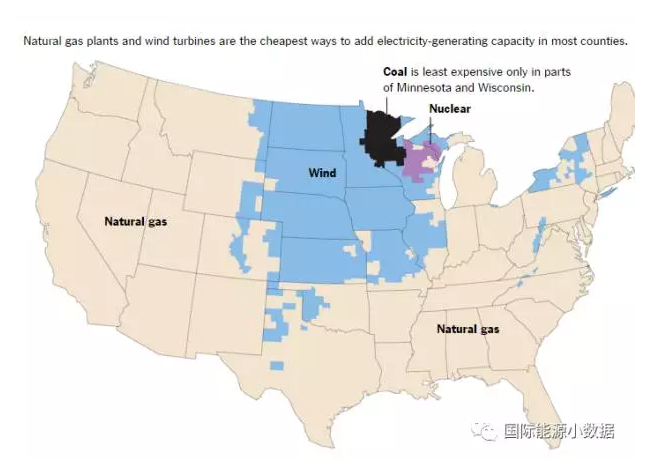 第一張圖:在不考慮政府對(duì)可再生能源的補(bǔ)貼,也不考慮外生環(huán)境和健康成本的情況下,天然氣發(fā)電在美國大部分的州是最便宜的電源,其次是風(fēng)電在若干的州是最便宜的電源,而煤電僅在明尼蘇達(dá)和威斯康星州地區(qū)具有成本優(yōu)勢(shì)。