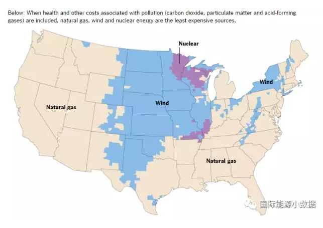 第二張圖:在不考慮政府對(duì)可再生能源的補(bǔ)貼,但考慮煤電污染環(huán)境帶來的健康成本和溫室氣體排放的影響,煤電完全出局,在美國任何州都沒有經(jīng)濟(jì)上的競(jìng)爭(zhēng)優(yōu)勢(shì),天然氣、風(fēng)電和核電成為不同地區(qū)的首選。