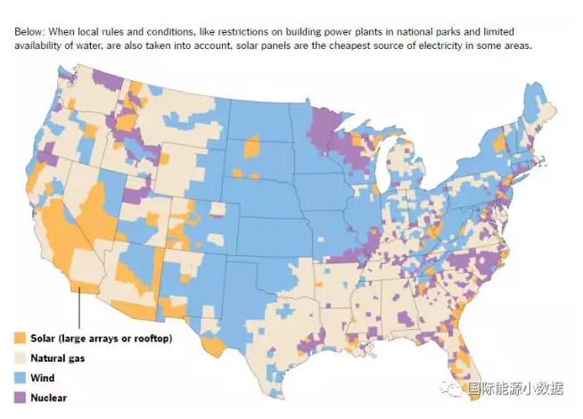 第三張圖:在不考慮政府對(duì)可再生能源的補(bǔ)貼,但考慮煤電污染環(huán)境帶來的健康成本和溫室氣體排放的情況下,再考慮美國各州對(duì)興建電廠(如國家公園地區(qū))的限制及水資源的短缺情況,那么除天然氣、風(fēng)電、核電以外,太陽能光伏在部分地區(qū)也成為首選,煤電完全沒有市場(chǎng)。