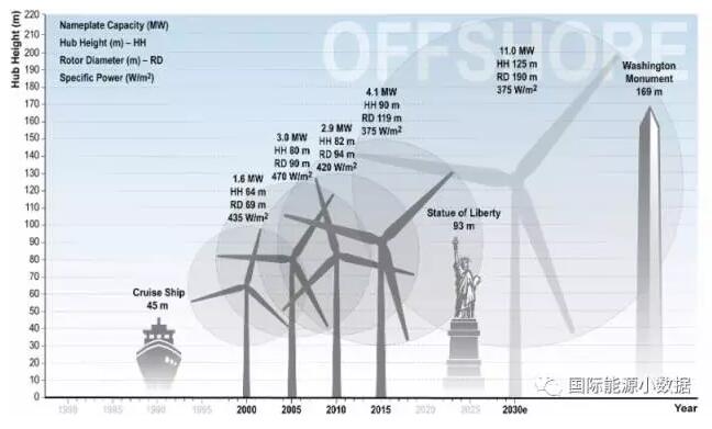 預(yù)計(jì)2030年,裝機(jī)容量可達(dá)11兆瓦,輪轂高度到125米,風(fēng)輪直徑達(dá)190米,而比風(fēng)功率保持在375瓦/平方米。
