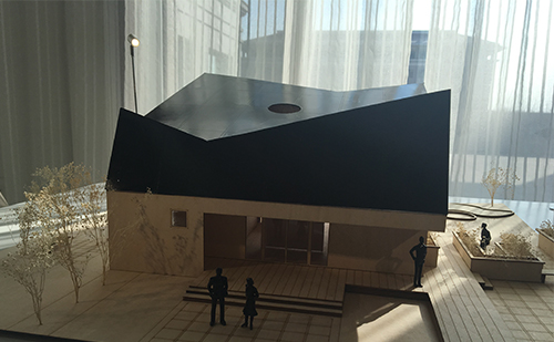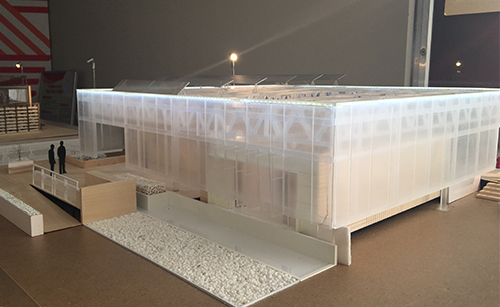 不規(guī)則的墻體,造型獨(dú)特的屋頂,側(cè)面看像祖孫三代手拉手。這個(gè)展出的建筑作品來自于福建工程學(xué)院和新澤西理工學(xué)院的聯(lián)合賽隊(duì)作品——DOTTIE“合·和”居。